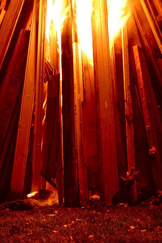 The other ideal thing about this Fawkes stuff is the fire. I am in complete awe of fire...I could stare at it for hours, constantly being amazed by it's intricate colours, shapes, sparks & the wonder of burning wood. I have no interest in making conversation when I'm near a fire - my mind goes off into another world which my camera helps me to capture. I edge closer & closer until I realise I'm almost close enough to join hands with Guy Fawkes who's straw body is being engrossed by flames. I have a tendency to let my personal safely fall by the wayside in these situations, even after all that health & safely stuff no one can ever forget after school days when even sitting on a chair in the classroom was a health hazzard. Haven't you heard the story of the boy who rocked backwards & died? What would be teacher say if they saw me getting so friendly with a bonfire?! Finally good sense & serious over-heating prevented anything too dramatic from occurring this bonfire night.